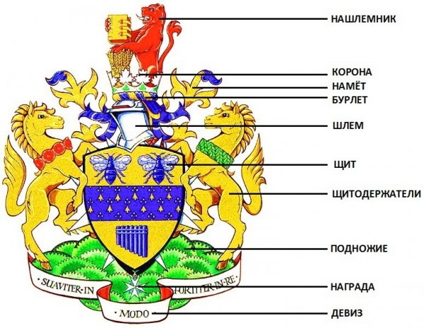 5) Всякая фигура занимает в гербе определенное место. При составлении современных гербов будущие владельцы желают поместить в рисунок как можно больше элементов, вероятно, рассчитывая, подчеркнуть его значимость.