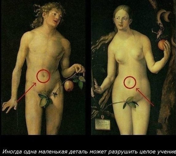 Действительно, ведь согласно библейскому преданию Адам создан из глины, а Ева – из его ребра! Но, в изобразительном искусстве разных эпох, как светском, так и церковном, изображаются Адама и Ева с пупком. Значит, их родила женщина?..