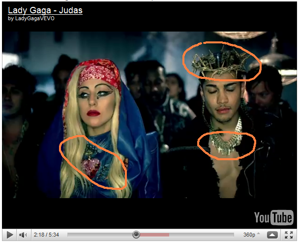 Разбор клипа Леди Гаги "Иуда". Появляется христианский крест и надпись Judas. Гага сначала едет на мотоцикле с номером 78. У нее уже христианский крест на груди. Едут по дороге с надписью Left Line - Левый Путь. Мотоциклисты - апостолы. Там есть Фома, Иоанн, Филипп, Петр, Симон, Иуда - всего 12. У всех на спине - череп с костями, все в черном. Значит сама Гага кто? Иисус получается.... И отца у неё зовут Джозеф=Иосиф. После она оказывается на мотоцикле Иуды еврейского типа, и едет за его спиной хотя ни разу на его спине не написано, что это Иуда. У него уже на шее куча крестов и цепей и она его за эти кресты и цепи держит, на голове - терновый венец. Шепчет что-то в правое ухо. Следующий эпизод - оргия в Electric Hostel, там она уже танцует с крестом на груди, крест на цепочке, показывает руками Сердце, Сердце нарисовано и на груди, требует Анахатную энергию. Потом инициирует Иуду и он становится почти как сам Иисус - благословляет толпу. Потом непонятное - один из апостолов светловолосый, арийского типа - вдруг оказывается Иудой. Кто же был изначально Иудой? Она на него направляет пистолет, вместо пули - помада. А сам Иуда в терновом венце. Какое то противостояние этого нового Иуды с первым Иудой - темноволосым. В Евангелиях там они постоянно между собой спорили, кто из них главнее. Далее кадры где она в море -, затем в купели. Ноги обоих апостолов на черном Камне - как и говорил Иисус - "на камне сем утверждаю мою Церковь". Она омывает ноги темноволосому Иуде повернувшись спиной к светловолосому. Один Иуда целует другого Иуду. Несколько кадров, где она почти в одеянии кардинала в черно-красном с крестом на цепочке. Кончается все тем, что она оказывается в белом ритуальном одеянии, падает на Землю и раскидывает руки в форме креста....