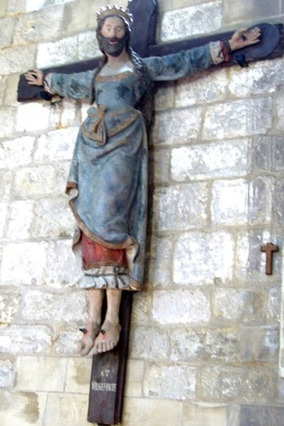 Вильгефортис (VirgoForis — стойкая дева, лат.), она же Либерата, дочь португальского короля, жила в Португалии 8 века и была обещана своим отцом сицилийскому королю в жены. Но Вильгефортис, как порядочная христианка, дала обет безбрачия и в сицилийском троне заинтересована не была. Накануне женитьбы она всю ночь молилась, и наутро у нее выросла борода, да еще какая — такой бороде позавидовал бы и лесоруб в тайге! Папе, конечно, такой фокус не понравился и он распял дочь, после чего ее канонизировали и назвали защитницей всех девушек, страдающих от чрезмерных ухаживаний, и жен, имеющих грубых мужей.