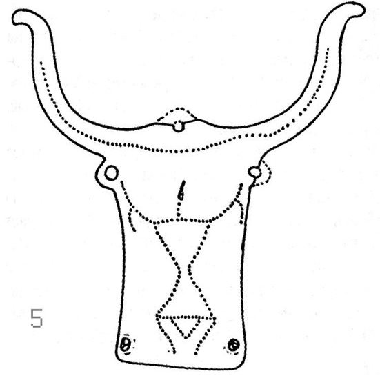 "Пунктирный силуэт Богини» виде «песочных часов» на костяной пластине с резным изображением головы быка. Кукутенская культура, Западная Украина. Ок. 3700-3500гг до н.э.; высота 17 см."