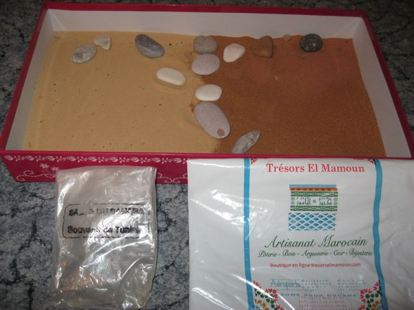 Песочница с песком из Сахары, который я оттуда специально привозила (слева - Тунисская Сахара, справа сверху - Египетская Сахара, справа снизу - Марокканская Сахара). И еще немного песочка туда из иорданской пустыни Вади Рам. Камешки привезли из Черногории...